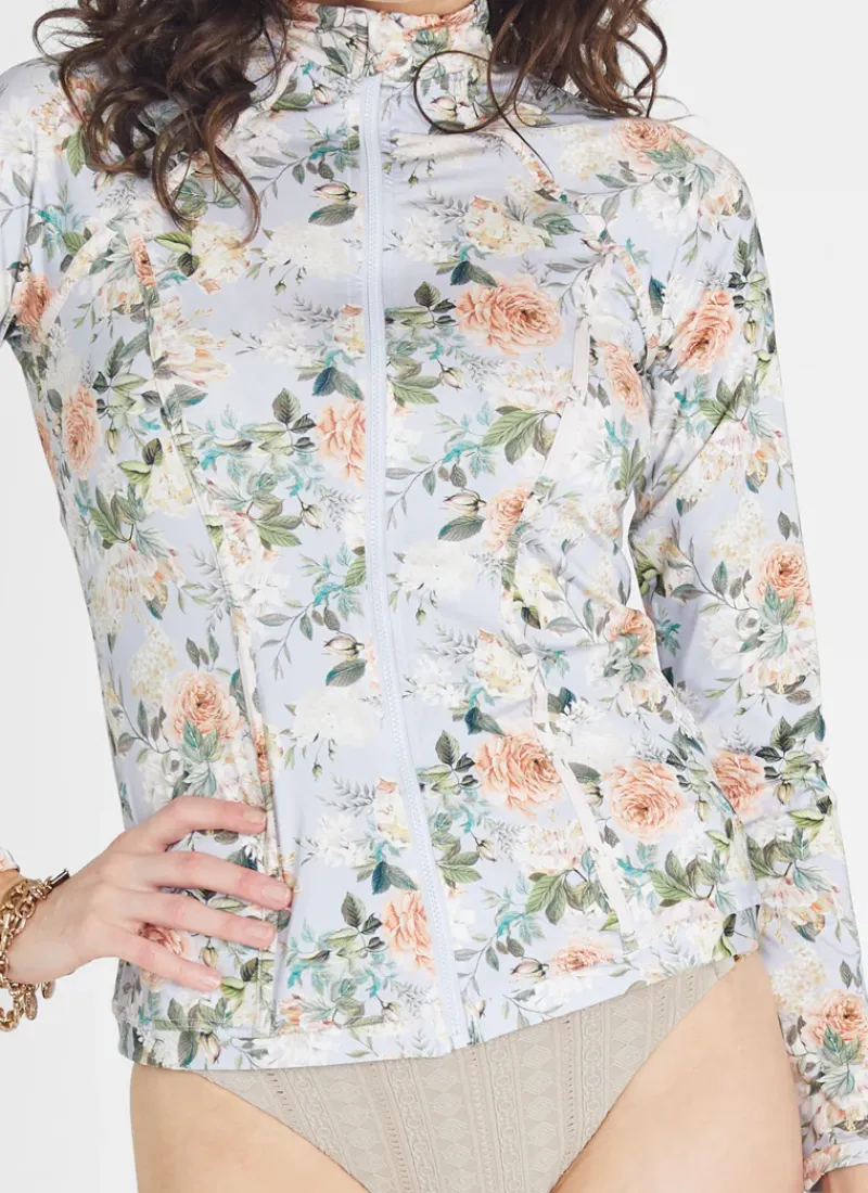 The Vervain Hayley Rash Guard by Aqua Blu Australia is a bold departure from the classic rash guard with a high neck collar and tapping. Protects from harmful UVA & UVB rays with a UPF 50+ Sun Protection rating