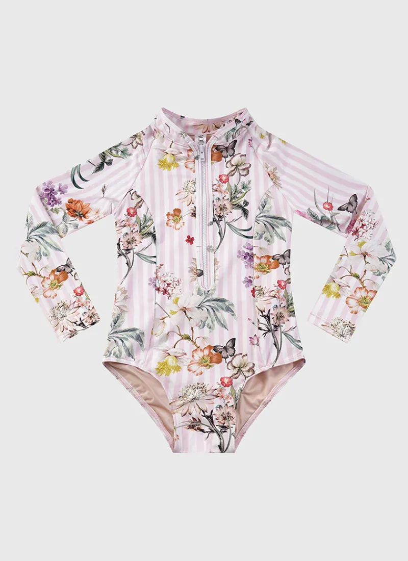 The Flutter Long Sleeve One Piece by Aqua Blu Australia features a UPF 50+ sun protection rating. It’s the perfect choice for your little ones to stay stylish and protected at the beach or pool.