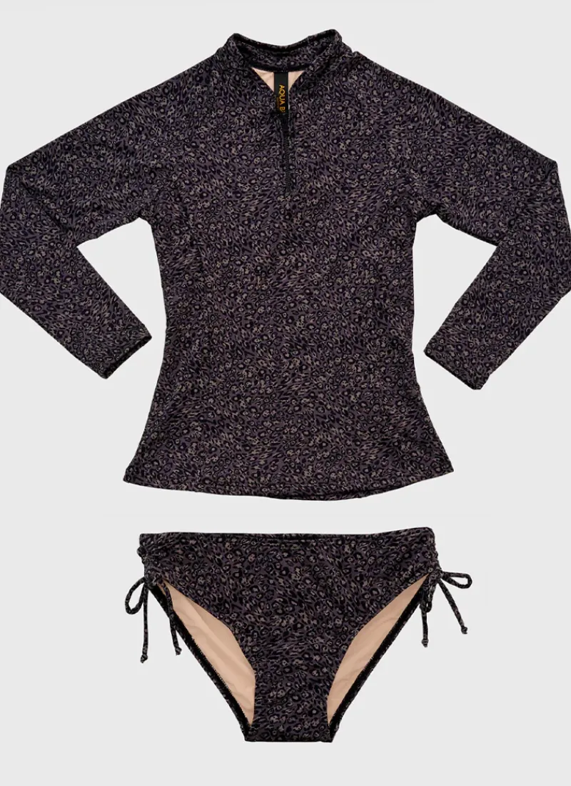 The Ocelot Rash Vest Set by Aqua Blu Australia is the ultimate two-piece set this Summer. This set features a sun safe tankini top with full length sleeves, paired with classic hipster bottoms.