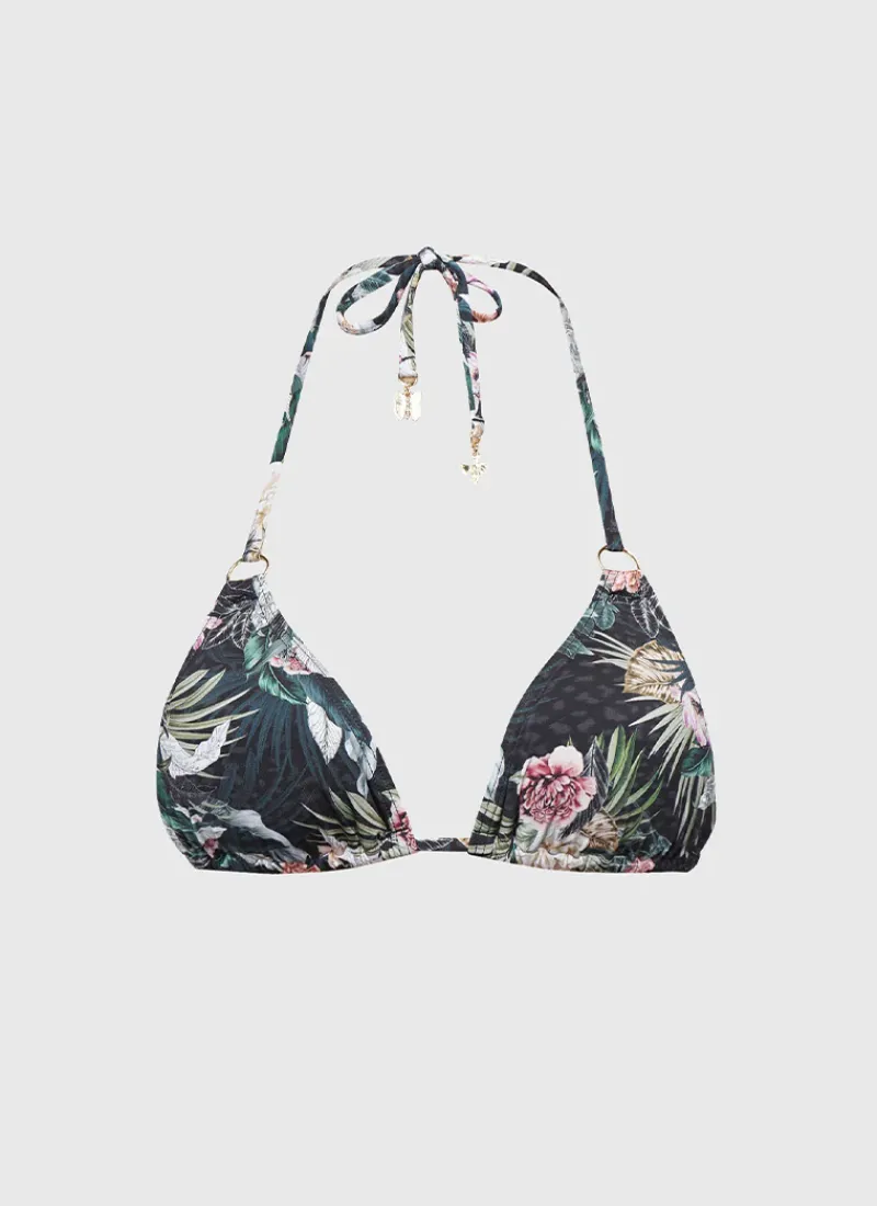 The Lisanthus Aurora Triangle by Aqua Blu Australia is the perfect blend of comfort and style. This classic triangle bikini top features removable cups for added versatility and a halter neck with adjustable tie neck and back to ensure the perfect fit. The charm detailing adds a touch of elegance and sophistication to this piece.