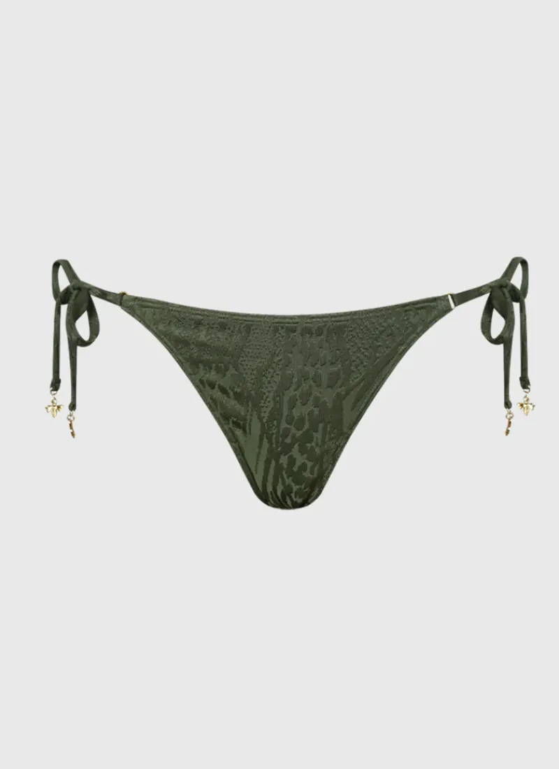 The Olive Felicity Tie Side Pant by Aqua Blu Australia is the perfect addition to any timeless swimwear collection. Featuring adjustable tie sides, ruched detailing on the back, and a charming charm detail, these bikini bottoms are designed for a comfortable and customizable fit.