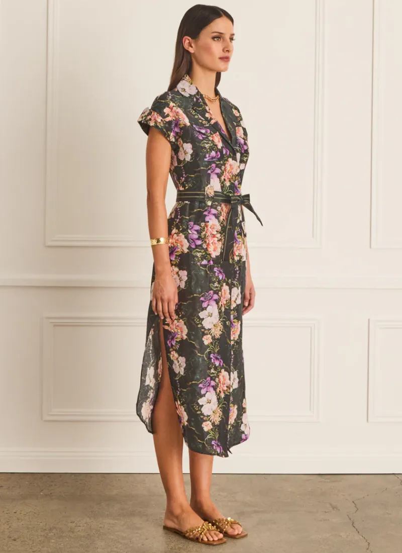 Crafted from a linen silk blend, this light weight midi-length dress boasts a relaxed fit and classic collar, accentuated by a button-through front and graceful cap sleeves. The Tempest Camilla Dress by Aqua Blu Australia features a removable tie belt for personalization, seamlessly transitioning from daytime chic to evening allure with timeless grace, the perfect wardrobe addition.