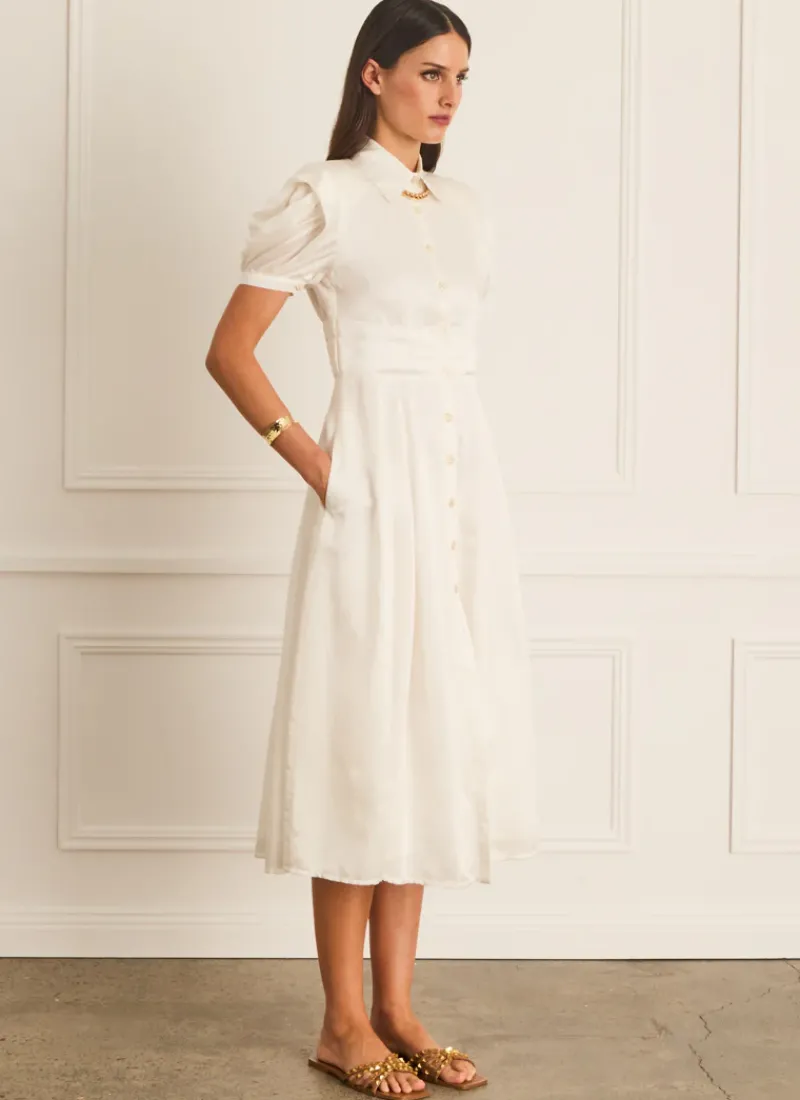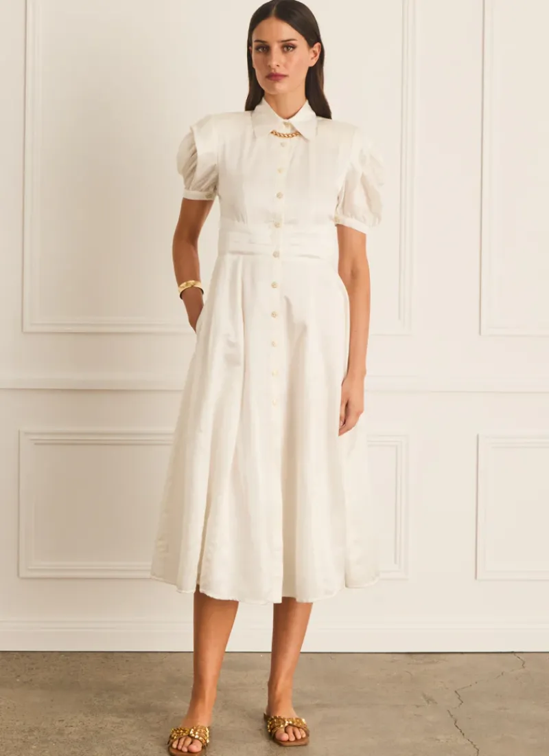 The Starling Macey Dress by Aqua Blu Australia is a vision of modern elegance and refined tailoring. With its form-fitting silhouette and midi length, it epitomizes sophistication and grace, making it a versatile choice for a variety of occasions. The classic collar and button-through front exude timeless charm, while the origami fold sleeves add a contemporary twist, creating a captivating visual appeal. Enhanced with subtle shoulder pads, this dress offers a structured yet graceful silhouette that effortlessly commands attention.