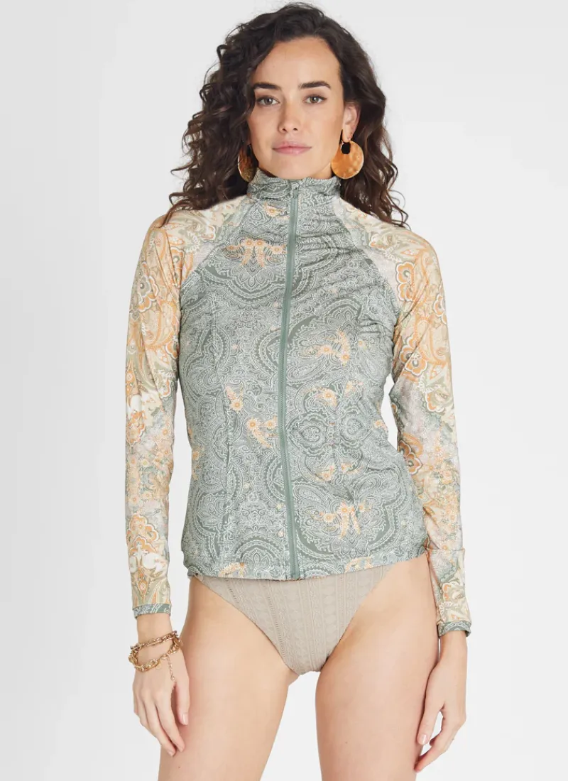The Floret Hayley Rash Guard by Aqua Blu Australia is a bold departure from the classic rash guard with a high neck collar and tapping. Protects from harmful UVA & UVB rays with a UPF 50+ Sun Protection rating