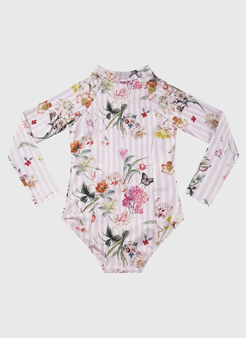 The Flutter Long Sleeve One Piece by Aqua Blu Australia features a UPF 50+ sun protection rating. It’s the perfect choice for your little ones to stay stylish and protected at the beach or pool.