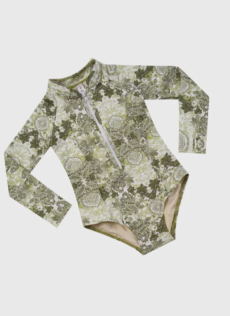The Tapestry Long Sleeve One Piece by Aqua Blu Australia features a UPF 50+ sun protection rating. It’s the perfect choice for your little ones to stay stylish and protected at the beach or pool.