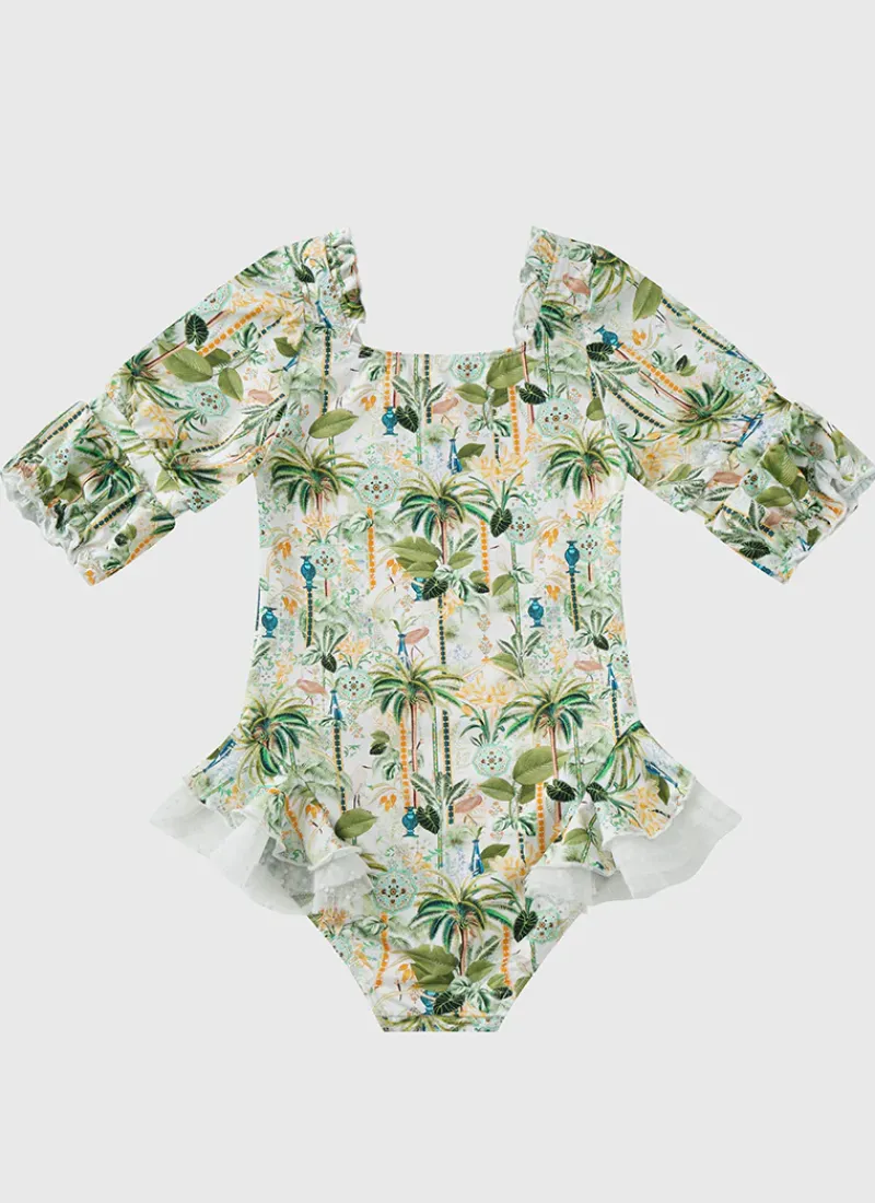 The Madagascar Short Sleeve Puff One Piece by Aqua Blu Australia features a UPF 50+ sun protection rating. It’s the perfect choice for your young ones to stay stylish and protected at the beach or pool.