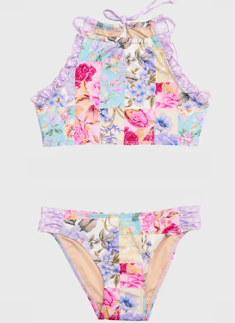 The Meadow Halter Bikini Set by Aqua Blu Australia is the ultimate bikini set for your active child featuring a high neck design and is paired with classic gathered side bottoms.