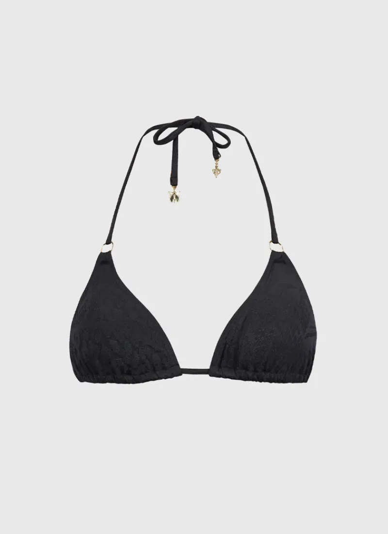 The Nero Aurora Triangle by Aqua Blu Australia is the perfect blend of comfort and style. This classic triangle bikini top features removable cups for added versatility and a halter neck with adjustable tie neck and back to ensure the perfect fit. The charm detailing adds a touch of elegance and sophistication to this piece.