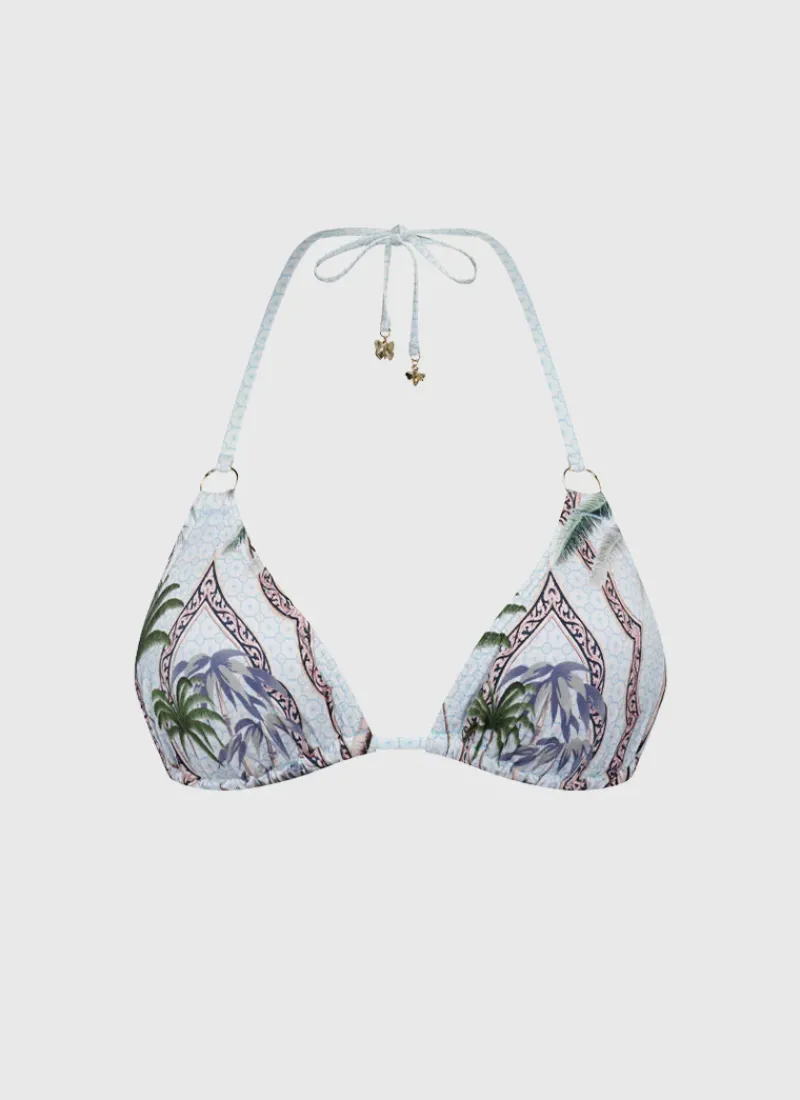 The Palmilla Aurora Triangle by Aqua Blu Australia is the perfect blend of comfort and style. This classic triangle bikini top features removable cups for added versatility and a halter neck with adjustable tie neck and back to ensure the perfect fit. The charm detailing adds a touch of elegance and sophistication to this piece.