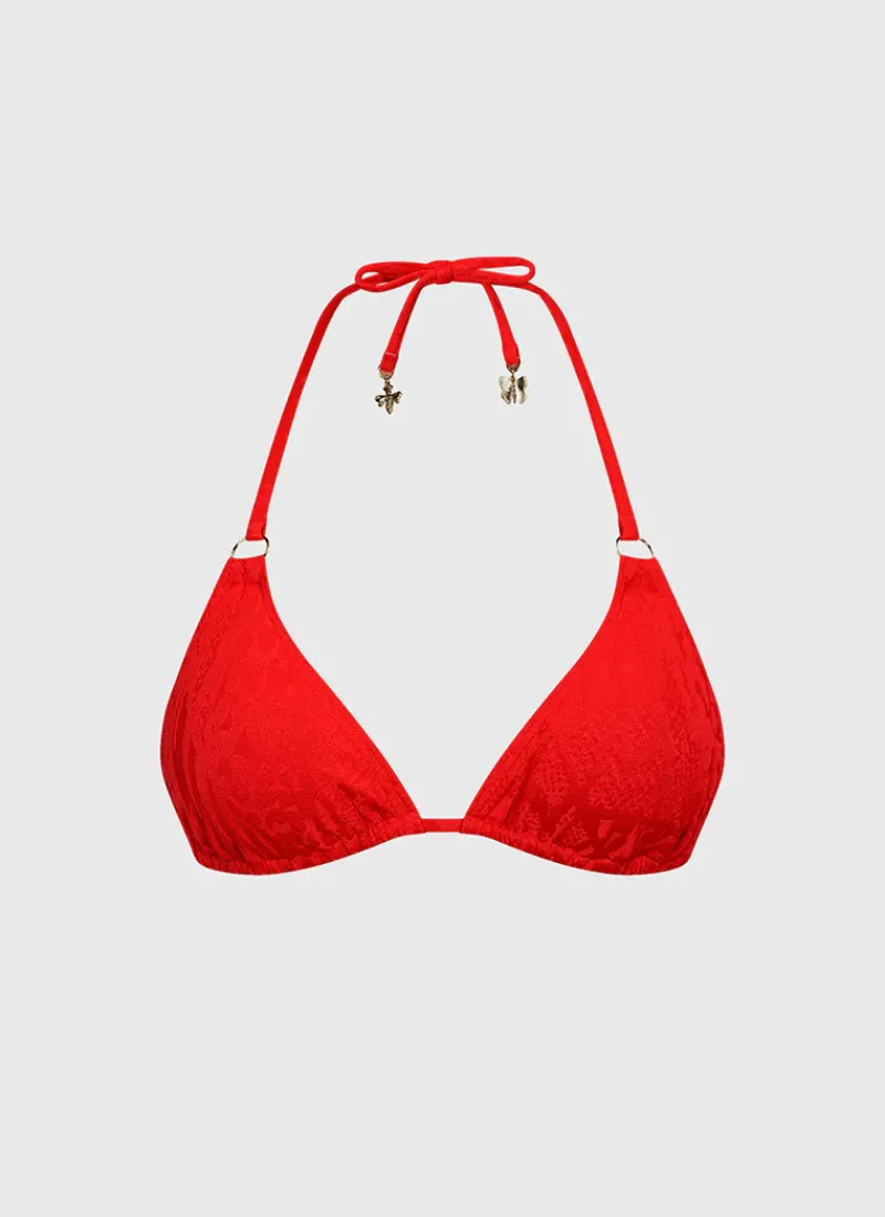 The Rossa Aurora Triangle by Aqua Blu Australia is the perfect blend of comfort and style. This classic triangle bikini top features removable cups for added versatility and a halter neck with adjustable tie neck and back to ensure the perfect fit. The charm detailing adds a touch of elegance and sophistication to this piece.
