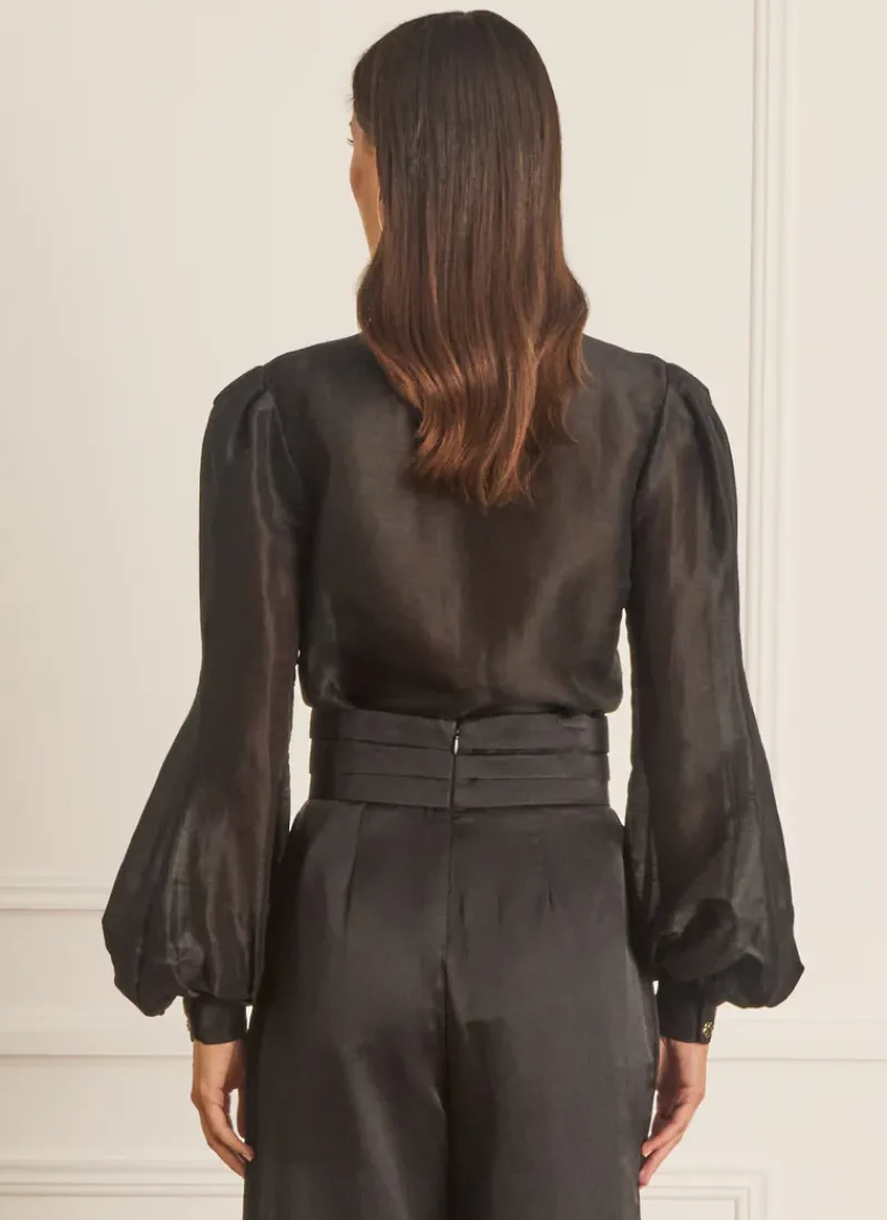 This form-fitting blouse by Aqua Blu Australia features a luxurious silk linen blend, ensuring both comfort and refinement. The Sparrow Hazel Blouse‘s standout feature is the contrast bib, adding depth and dimension to the ensemble. With a high neck collar and blouson sleeves adorned with button-up cuffs, it offers a perfect balance of elegance and contemporary charm.