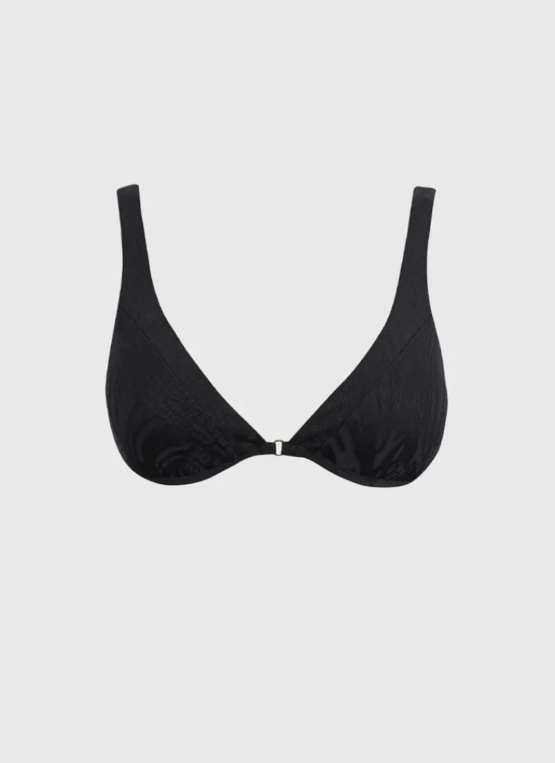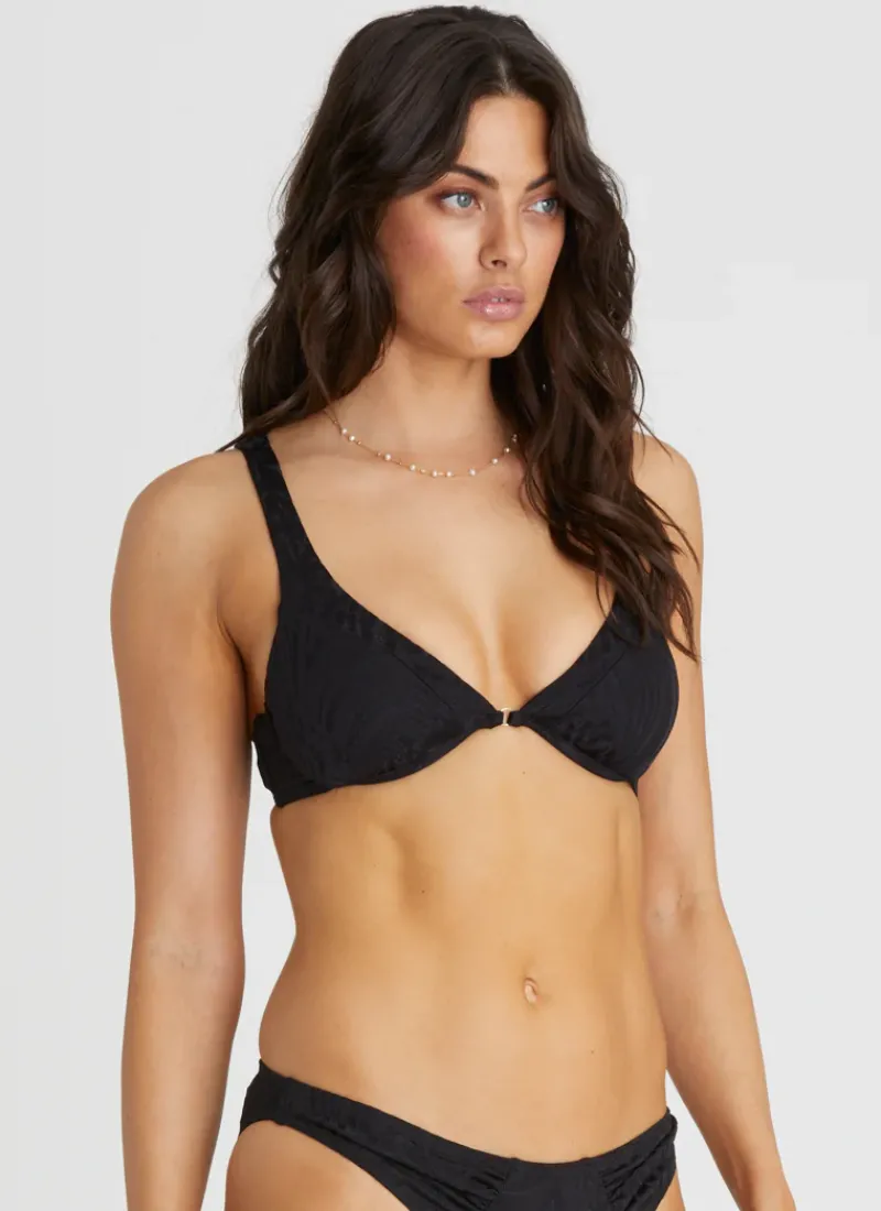 The Nero Linda Bikini Top by Aqua Blu Australia features underwire support and removable cups for customizable comfort, as well as adjustable straps and a back clasp for the perfect fit. This bikini top is perfect for any beach day or poolside lounging.